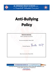 Page 1 of 3 ANTI-BULLYING POLICY PURPOSE: Al Diyafah High School has a zero-tolerance approach to bullying, in any form, as we believe that each child has the right to an educational environment where they can feel safe and valued. The prevention, identification and reporting of bullying is the responsibility of all ADHS staff, students, and parents. SCOPE: This policy is applicable to all ADHS staff, students and parents. The policy covers all forms of bullying. It is the responsibility of all members of the school community to ensure that all community members may learn and work in a safe, supportive and positive environment. ABOUT BULLYING: Here, at Al Diyafah, we define bullying as behaviour that is repetitive, intentional and involves a misuse of power in the relationship. This can be by an individual or group causing harm, distress, or fear to the victim. Bullying can take on many forms and includes • Verbal: Name calling, cursing, spreading rumours, teasing, or making anonymous phone calls. • Physical: Any acts of violence like pushing, kicking, beating, or taking other’s belongings and hiding it. • Social: Persuading others to ignore someone causing emotional distress. • Suggestive: Gestures that may come across as threatening or rude. • Cyberbullying: An aggressive, intentional act carried out by a group or an individual using electronic forms of contact repeatedly, mostly anonymously, 24/7 against a victim who cannot easily defend himself/herself. ACTIONS/CONSEQUENCES: The corrective actions and consequences relating to all forms of bullying behaviour whether, verbal, physical, emotional, social, suggestive and or cyber are included in the Behaviour for Learning Policy. How to respond to bullying. If a student feels they are being bullied, then they should: • Reach out to someone they are comfortable with. • Students have been informed about their various points of contacts (whom to go to if a problem occurs) here in school. Starting with their Form Tutors, followed by the Head of Year, then the Key stage Head and finally the Head of Section or any member of the Senior Leadership Team (SLT). Prevention of bullying can be achieved through: • Respecting others • Not giving in to peer pressure • Learning to be tolerant and broadminded • Celebrate individual differences • Be aware of the schools anti bullying policy