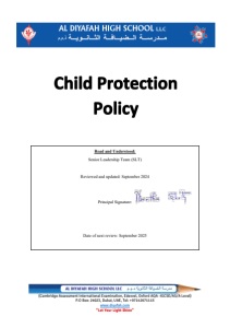 Al Diyafah High School-Reviewed policies- September 2023 AT&L23-24 CHILD PROTECTION POLICY PURPOSE: POLICY STATEMENT Al Diyafah High School is concerned about the welfare, wellbeing, safety and best interests of all its pupils and attempts to create an environment in which pupils feel secure and valued and in which they are listened to and taken seriously. This policy aims to outline the identification process to promote positive child protection, the management of such cases, people responsible for it and the precautions taken by school in lieu of the KHDA guidelines for child protection. All cases of child protection shall be dealt with in line with the Federal Law No. (3) of 2016 regarding the Child Rights Law (Wadeema) and Cabinet Resolution No. (52) of 2018 regarding implementing regulation of Federal Law No. (3) of 2016 regarding child rights. SCOPE: OUR COMMITMENT: - We endeavour to make our school a safe and happy place. We ensure that our recruitment and induction procedures are aligned to the Child Protection Policy of the School and any case of reported Child Abuse is immediately responded to as per the laid procedures. We recognise that children who are abused or witness violence may find it difficult to develop a sense of self-worth. They may feel helplessness, humiliation and some sense of blame. The school may be the only stable, secure and predictable element in the lives of children at risk. Our commitment against Child Abuse is reflected in: - • The content of the curriculum; such as our School Assemblies; Value Education Program, Moral Education and class discussions. • The school ethos which promotes a positive, supportive and secure educational environment and gives pupils a sense of being valued. • The School’s Wellbing Policy, Positive Behaviour & Anti-bullying policy which are aimed at supporting vulnerable pupils in the school and enhancing their welfare and wellbeing. • The practice of training all teaching Staff, CPO, board of management, bus attendants & drivers and all members in the school concerned with the welfare of the students. RESPONSIBILITIES: The Child Protection Policy Guidelines are divided into the following sections: 1. Recognising signs of abuse 2. Dealing with Disclosure 3. Role of the Child Protection Committee 4. Staff Code of Conduct 1. Recognizing Signs of Abuse It can often be difficult to recognize abuse. The signs in these guidelines are only indicators and many can have reasonable explanations. Children may behave strangely or seem unhappy for