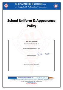 Page 1 of 3 SCHOOL UNIFORM AND APPEARANCE POLICY Al Diyafah High School's uniform policy ensures students maintain a neat and professional appearance, both in school and in the wider community. We expect all students to take pride in their uniform and represent the school positively. Parental support is crucial in maintaining these standards, which reinforce our school's values and create a respectful learning environment. The uniform acts as a clear identifier of our students and promotes a sense of unity. School Uniform All students are required to wear the proper school uniform and modification to the uniform is not allowed. Identity card should be worn at all times. Students are expected to keep their appearance neat and tidy. Uniform for boys: 1. Prescribed school trousers & shirt 2. School Tie (Year 7 onwards) 3. ID- cards with blue /red lanyard 4. Black school shoes 5. PE uniform with running sports shoes, predominantly white Uniform for girls: 1. Prescribed school shirt, knee-covered skirt/trouser (Primary), Ankle-length skirts/trouser (Secondary) 2. School Tie 3. ID- cards with blue /red lanyard 4. Black school shoes 5. PE uniform with running sports shoes, predominantly white Students are required to wear the complete and correct uniform on campus, during travel to and from school, for after-school activities, and on all school trips unless alternative instructions are provided by a staff member. This standard also applies to PTCI and all formal ADHS events. Whole School Uniform and appearance policy violations and the actions taken: Category Expectations Deviance Examples Consequences Shoes • Full Black leather (formal) shoes without any other colors on them. • White trainer shoes with PE uniforms Noncompliance with shoe color/Type of shoe Colored logos or stripes, nonblack shoes, colored casual/sports shoes Verbal warning /Diary Note Email to Parent/Call to Parent Meeting with Parent Students will be required to change their shoes, regardless of whether they are newly purchased.